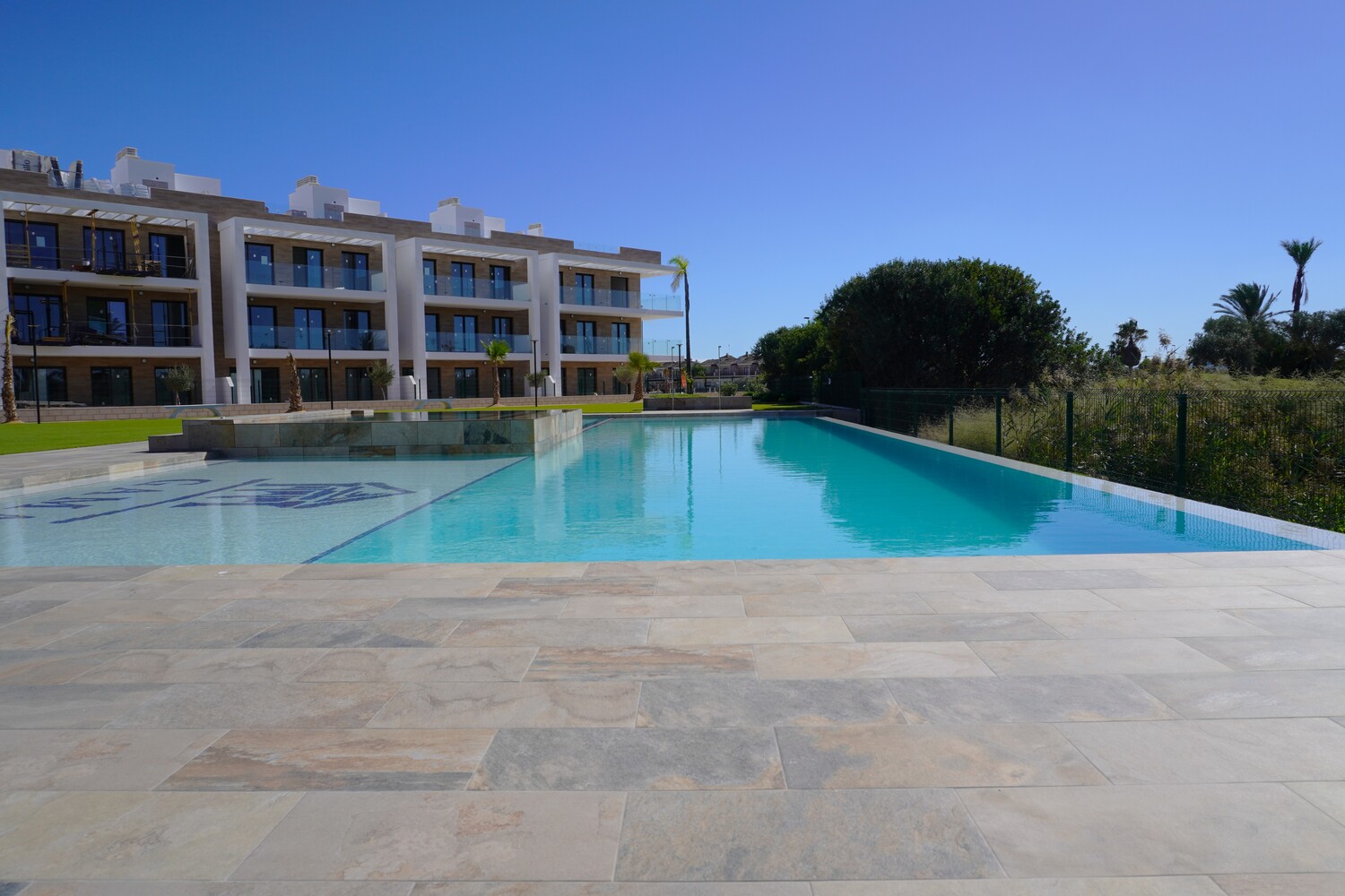Toplocatie voor golf- en natuurliefhebbers, deze moderne begane grond appartementen met een aangelegde tuin/terras van 68 m2, voorzien van 2 of 3 slaapkamers en 2 badkamers waarvan 1 badkamer en suite. Door de gevelbekleding met houtnerftegels heeft het geheel een luxe uitstraling. De woningen met een bebouwd oppervlak van respectievelijk 83 m2 en 105 m2, afhankelijk van het aantal slaapkamers, bevinden zich op slechts 1 km van de zee en zijn geschikt voor zowel permanente bewoning als verhuur. Ze worden opgeleverd inclusief een parkeerplaats in de ondergrondse parkeergarage met 5-7 m2 berging voor oa fietsen. De parkeergarage is bereikbaar met de lift. De erg mooi aangelegde gemeenschappelijke ruimte met veel groen heeft 2 zwembaden waarvan het infinity zwembad prachtig zicht heeft over het golfresort. Naast het zwembad zijn toiletten en er is een ruimte met kinderspeeltoestellen.
