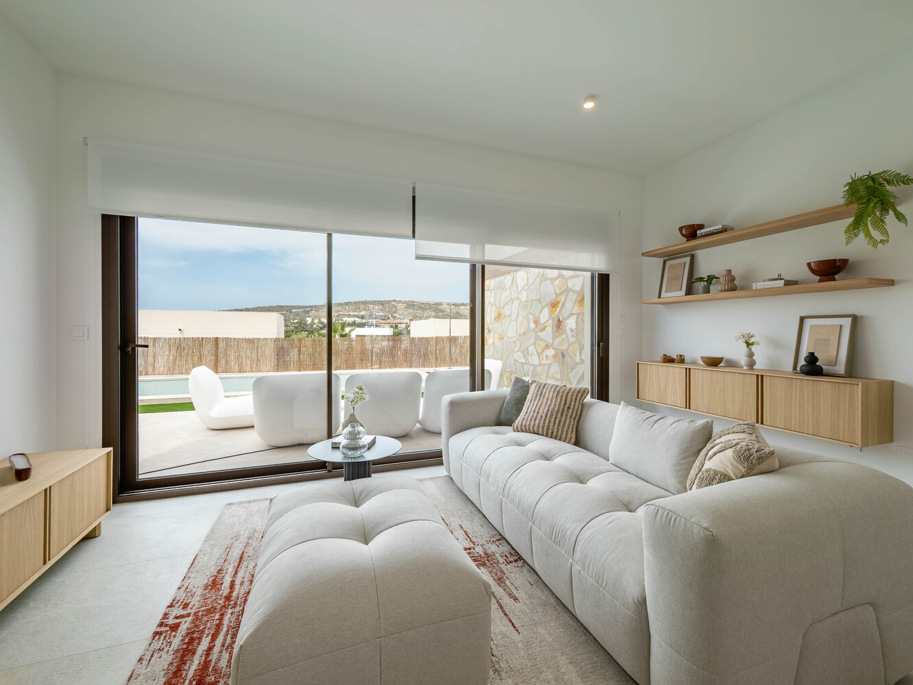 De villa’s beschikken over drie slaapkamers: twee comfortabele slaapkamers met een gedeelde badkamer op de begane grond, en een luxe master bedroom met en-suite badkamer op de eerste verdieping. Vanuit deze master suite heeft u direct toegang tot een prachtig solarium van 30 m² – de ideale plek om te ontspannen en te genieten van het uitzicht. De fraai aangelegde tuin is volledig voorzien van beplanting en een automatisch irrigatiesysteem, zodat u zonder zorgen van uw nieuwe woning kunt genieten.